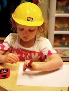 Preschoolers line up in their yellow hardhats eager to explore the construction area outside their classroom.