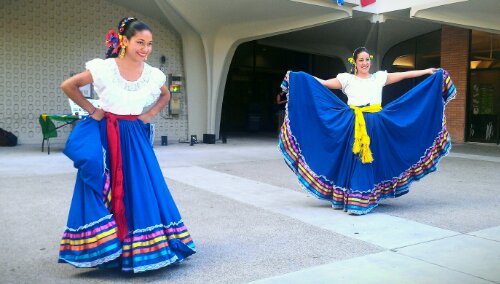 Cal State Fullerton students, and ballet folklorico performers, wrap up a dance in front of the Humanities and Social Sciences building.